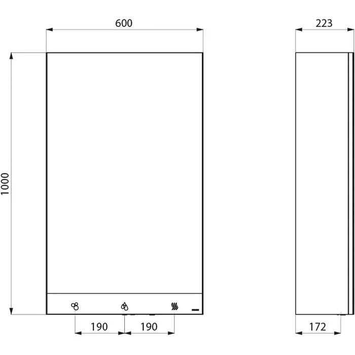 Miroir verre de 4 mm d’épaisseur et bandeau de verre noir avec pictogrammes lumineux.