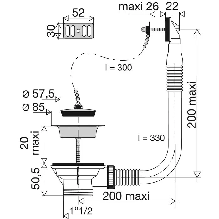Cette bonde est destinée à un évier 1 cuve avec trop plein percé en diamètre 60 mm. A bouchon-chaînette, la cuvette en inox mesure 85 mm de diamètre et le bouchon à enjoliveur chromé 57,5 mm. Le serrage est possible sur l’orifice de l’évier de 0 à 60 mm. La vis centrale est en inox. Le tube de trop-plein a un diamètre de 25 mm et sa longueur est de 330 mm. 2 grilles de trop plein sont fournies: rectangulaire et ronde.