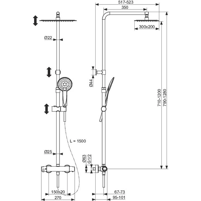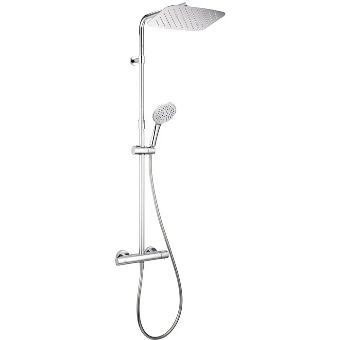 Mitigeur thermostatique 2 sorties Inverseur céramique 2-Way Colonne laiton réglable (25/22 mm) – Entraxe 35 cm Douche de tête inox extra-plate 300 x 200 mm Easy-Clean Douchette Minéral 120 – 3 jets Support douchette coulissant à bouton Flexible lisse avec écrous coniques 150 cm Silverflex NF 2 Raccords excentrés et 2 rosaces |