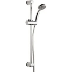 Douchette Boréal Ø 80 mm, 1 jet anti-calcaire Barre inox Ø 19 mm, pieds ABS, curseur réglable et orientable Déplacement du curseur par pression sur un bouton Flexible double agrafage inox chromé 1,75 m |