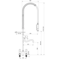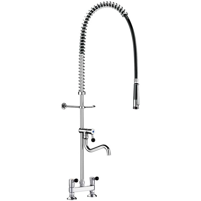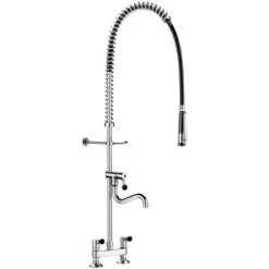 Composition du combiné de prélavage : – colonne 3/4″ en laiton massif chromé – collier mural réglable – ressort guide en inox – flexible armé noir, long. 0,95 m – douchette réglable : pluie ou concentré |