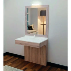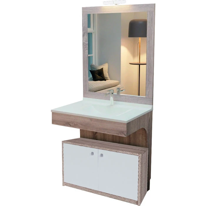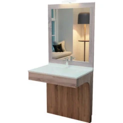 Corps de meuble sous vasque en panneaux de particules mélaminés (PPM) décor Cambrian Oak, de 16 mm d’épaisseur. Il existe en option la possibilité d’avoir un meuble bas de rangement sur roulette en 70 ou 80 cm de large.