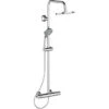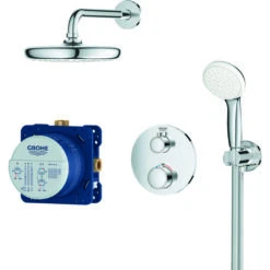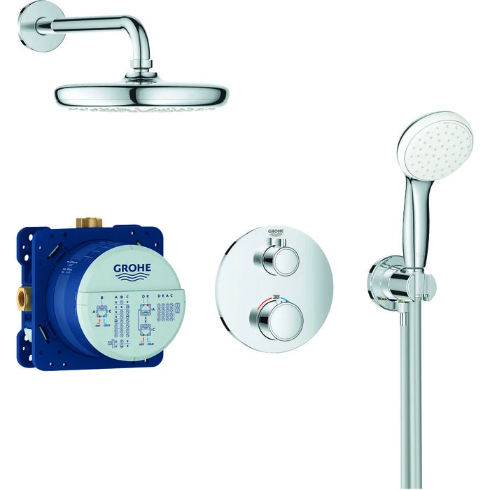 L’ensemble est composé d’un mitigeur thermostatique Grohtherm rond et ultra fin, d’un corps encastré universel GROHE Rapido SmartBox pour les installations encastrées, d’une douche de tête Tempesta 210 mm avec bras de 286 mm, d’une douchette à main Tempesta de 100 mm avec support et flexible Rotaflex TwistFree de 1500 mm.