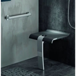 Ce siège de douche gris possède un piètement en aluminium et une assise ergonomique grande taille de 45 cm en polymère. Cette dernière est fixée sur une structure aluminium époxy. Il a une position de verrouillage et peut être déclipsé de son support mural pour l’entretien et l’utilisation occasionnelle en collectivité. Une tablette peut être montée sur le support à la place du siège.