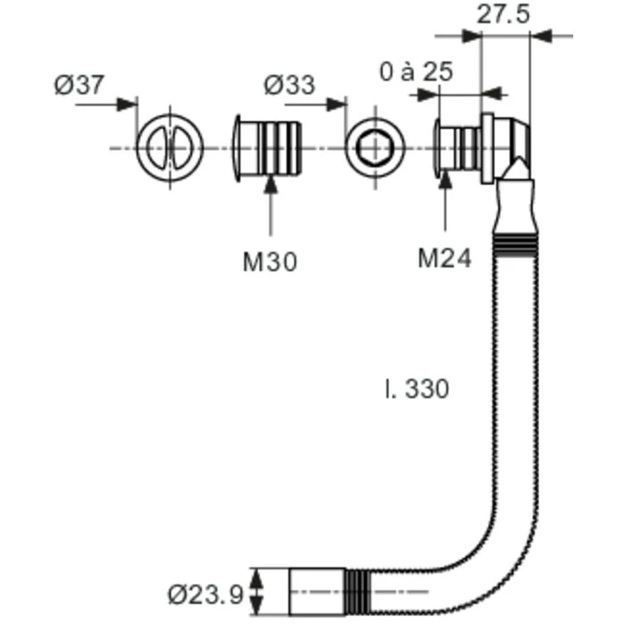 Ce kit de trop plein est universel et se raccorde à une prise de trop plein de vidage de lavabo ou vasque. Le tube de trop plein mesure 330 mm et est polypropylène blanc. Deux enjoliveurs de tailles différentes sont fournis pour s’adapter aux différents lavabos ou vasques: diamètre 24 mm et diamètre 30 mm. Le serrage est possible de 0 à 25 mm et la longueur des enjoliveurs est de 35 mm.