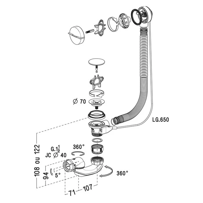 Tube de trop-plein prémonté et réglable de + ou – 20 cm